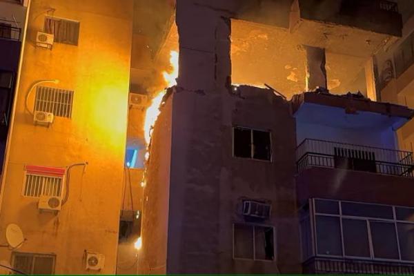 Kebakaran terjadi di lantai gedung setelah serangan Israel, di Sidon, Lebanon, 4 April 2025. REUTERS