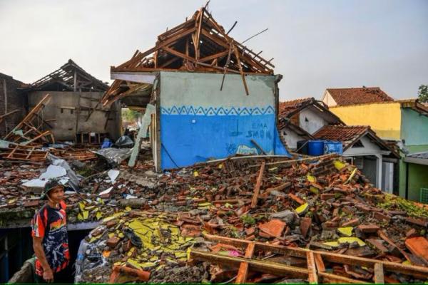 Seorang pria berdiri di dekat rumah-rumah yang rusak akibat angin puting beliung di desa Sukadana di Sumedang, provinsi Jawa Barat, Indonesia, 22 Februari 2024. Antara Foto via Reuters