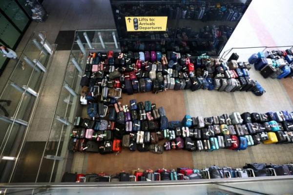 Barisan bagasi penumpang terletak di luar Terminal 2 di Bandara Heathrow di London, Inggris, 19 Juni 2022. Foto: Reuters
