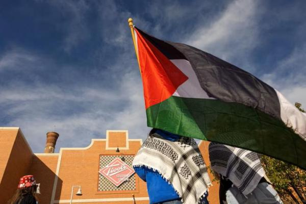 Para pengunjuk rasa mengibarkan bendera Palestina di luar perkumpulan mahasiswa di Kampus Auraria di Denver, Colorado, AS, 14 Mei 2024. REUTERS