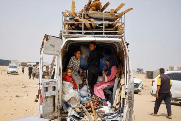 Pengungsi Palestina dari keluarga Salman menaiki kendaraan yang penuh dengan barang-barang saat mereka bersiap untuk meninggalkan Rafah di Jalur Gaza selatan, 27 Mei 2024. REUTERS