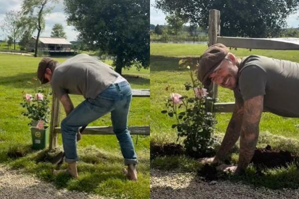 David Beckham akhirnya berhasil memindahkan tanaman mawar merah muda itu ke dalam tanah, mengemas tanah di sekitarnya agar stabil sebelum melihat langsung ke kamera istrinya.