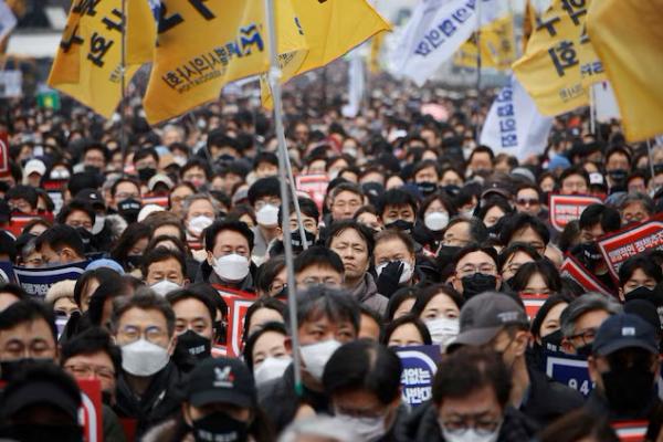 Ribuan dokter peserta pelatihan, termasuk dokter magang dan dokter residen, mengundurkan diri dari pekerjaannya pada tanggal 20 Februari, sehingga memaksa rumah sakit-rumah sakit besar untuk mengurangi layanan non-darurat dan mengembalikan pasien ke ruang gawat darurat.