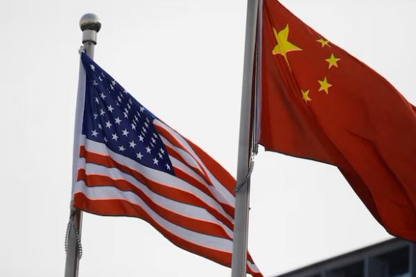 Bendera Tiongkok dan AS berkibar di luar gedung perusahaan Amerika di Beijing, Tiongkok 21 Januari 2021. REUTERS