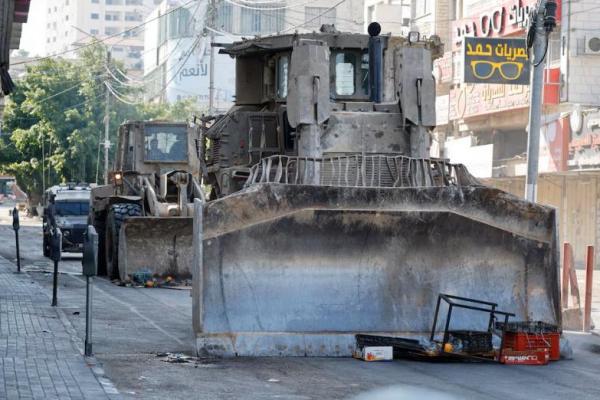 Sebuah buldoser militer beroperasi selama serangan Israel di Jenin, di Tepi Barat yang diduduki Israel 13 Juni 2024. REUTERS