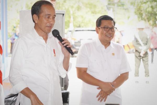 Kepala Badan Pangan Nasional atau National Food Agency (NFA) Arief Prasetyo Adi mendampingi Presiden Joko Widodo meninjau penyaluran bantuan pangan beras di Perum Bulog Kalangkangan, Tolitoli, Sulawesi Tengah, Rabu (27/3/2024).