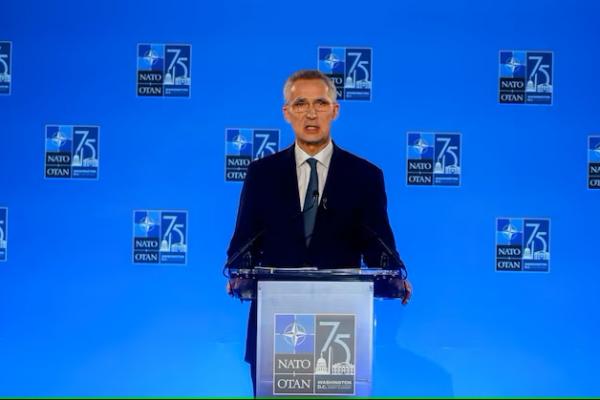 Sekretaris Jenderal NATO Jens Stoltenberg mengadakan konferensi pers, pada pertemuan puncak peringatan 75 tahun NATO, di Washington, AS, 10 Juli 2024. REUTERS