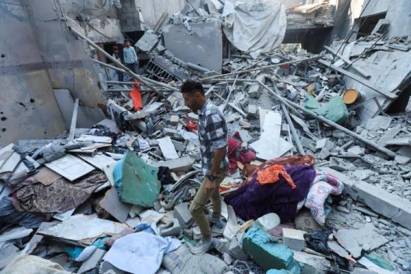 Seorang pria Palestina memeriksa lokasi serangan Israel terhadap sebuah rumah, di Jalur Gaza tengah, 16 Juli 2024. REUTERS