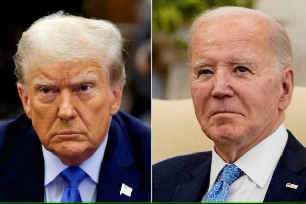 Gambar kombinasi mantan Presiden AS Donald Trump menghadiri persidangan perdata pada 6 November 2023, dan Presiden AS Joe Biden di Gedung Putih di Washington, AS, 1 Maret 2024. REUTERS
