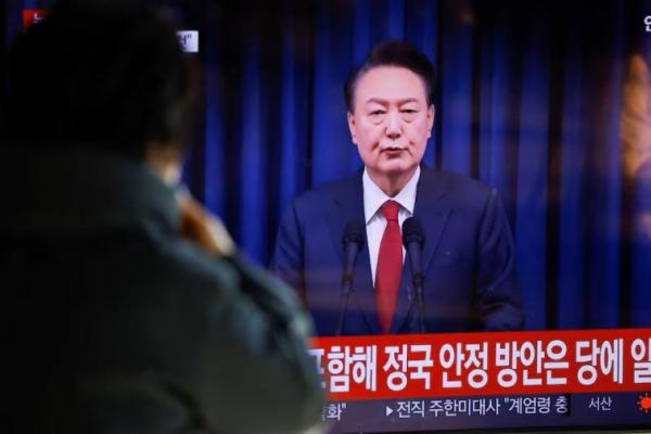 Seseorang menonton siaran pidato Presiden Korea Selatan Yoon Suk Yeol di sebuah stasiun kereta api di Seoul, Korea Selatan, 7 Desember 2024. REUTERS