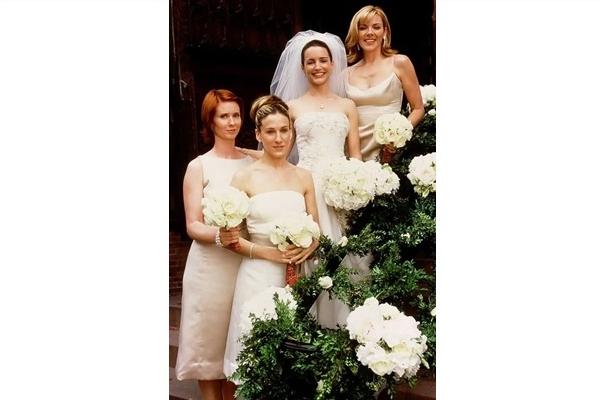Para pengiring pengantin Charlotte termasuk Carrie, Samantha (Kim Cattrall), dan Miranda (Cynthia Nixon) semuanya mengenakan gaun Vera Wang berwarna krem yang gayanya sedikit bervariasi.