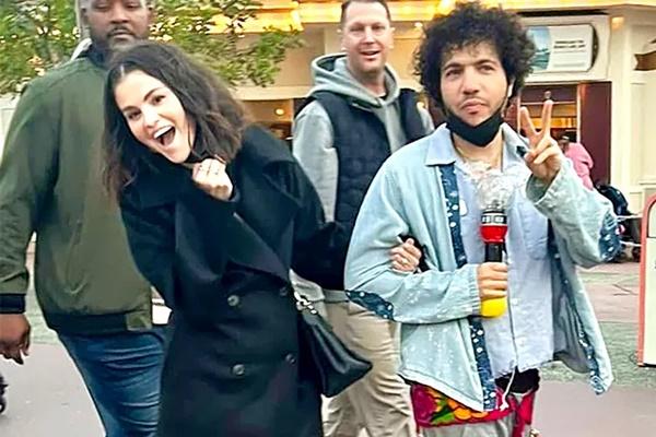 Selama jalan-jalan di taman hiburan, Selena Gomez dan Benny Blanco (36) tersenyum untuk difoto cepat saat mereka berjalan-jalan ditemani oleh petugas keamanan.