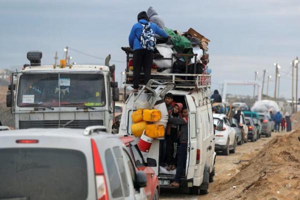 Warga Palestina menunggu untuk menyeberangi pos pemeriksaan antara Gaza selatan dan utara, dekat Kota Gaza, 9 Februari 2025. REUTERS