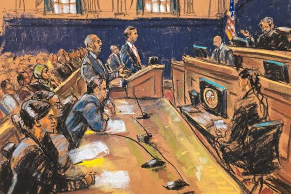 Suasana sidang Mahmoud Khalil, aktivis Palestina dan mahasiswa pascasarjana Universitas Columbia, di New York City, AS, 12 Maret 2025 dalam sketsa ruang sidang. REUTERS
