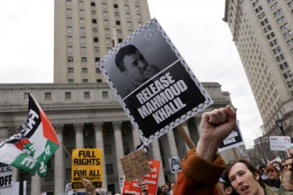 Demonstran memegang plakat saat berunjuk rasa saat sidang penahanan aktivis Palestina dan mahasiswa pascasarjana Universitas Columbia Mahmoud Khalil, di New York City, AS, 12 Maret 2025. REUTERS