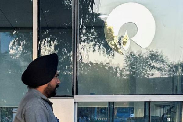 Seorang penjaga berjalan melewati logo Reliance Industries di dekat pintu masuk Dhirubhai Ambani Knowledge City di Navi Mumbai, 15 Maret 2024. REUTERS