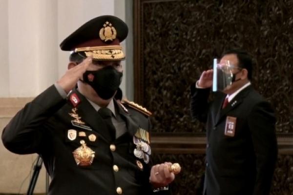 Katakini.com - Jenderal Pol Idham Azis menyerahkan Panji Kepolisian Tribrata kepada Kapolri Jenderal Pol Listyo Sigit Prabowo dalam acara serah terima jabatan Kapolri di Rupatama Mabes Polri, Jakarta, Rabu (27/1/2021).