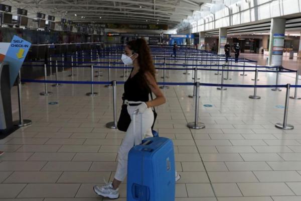 Seorang pelancong yang mengenakan masker di Bandara Internasional Larnaca, setelah Siprus membuka bandaranya. Foto: Reuters