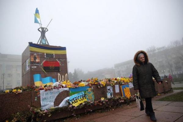 Seorang wanita berjalan melewati sebuah patung di alun-alun pusat setelah militer Rusia mundur dari Kherson, Ukraina 21 November 2022. Foto: Reuters