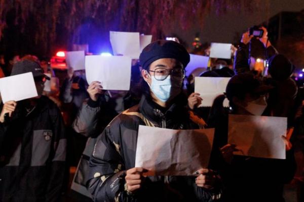 Orang-orang berkumpul dan memegang lembaran kertas putih sebagai protes atas pembatasan Covid di Beijing, China, 27 November 2022. Foto: Reuters