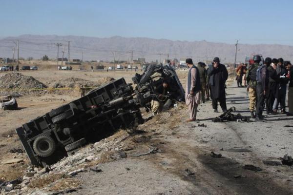 Pejabat polisi Azfar Mehsar mengatakan kepada wartawan bahwa pengebom menabrakkan kendaraannya ke truk polisi, meledakkan bahan peledak dan memaksa truk polisi terjun ke jurang.