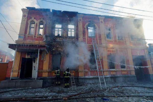 Petugas pemadam kebakaran bekerja di luar gedung perkantoran yang hancur akibat serangan Rusia di Donetsk, 5 Desember 2022. Foto: Reuters