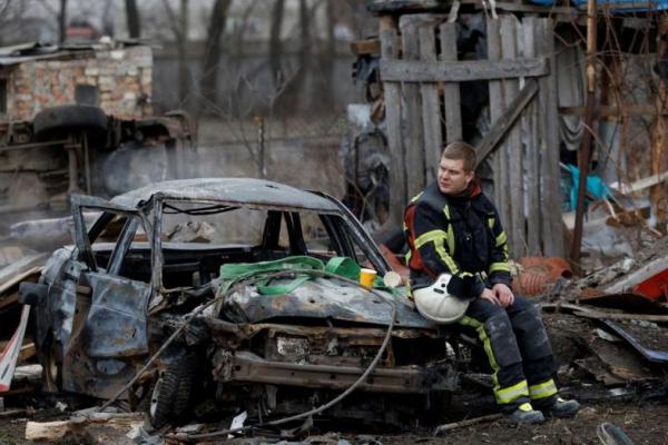 Seorang penyelamat beristirahat di sebuah lokasi rumah tinggal yang rusak akibat serangan rudal Rusia, di Kyiv, Ukraina 29 Desember 2022. Foto: Reuters