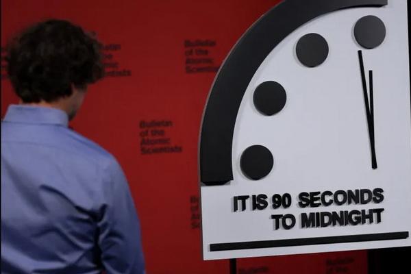 Jam Kiamat metaforis, alat desain yang digunakan untuk melambangkan seberapa dekat manusia dengan kepunahan, telah mendekati tengah malam, menandakan risiko yang lebih besar dari perang nuklir dan bencana lain yang mengancam kehidupan di Bumi.
