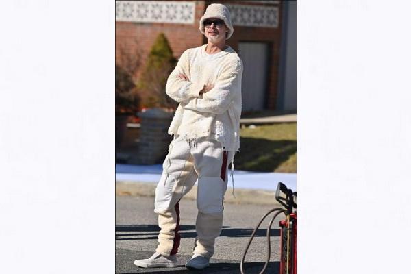 Brad Pitt (59), menoleh kemarin saat berjalan menyusuri jalan dengan sweater krem-dan-cokelat tie-dye dengan keliman yang terurai, ditambah celana bulu dua warna dan sepatu kets putih.