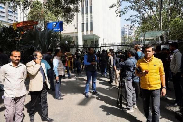 Anggota media dan orang-orang berdiri di luar gedung kantor BBC, tempat petugas pajak melakukan penggeledahan, di New Delhi, India, 14 Februari 2023. Foto: Reuters