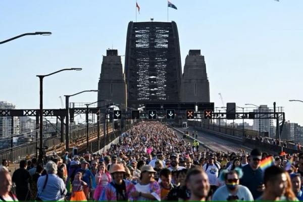 Orang-orang berbaris melintasi Sydney Harbour Bridge untuk kesetaraan sebagai bagian dari festival WorldPride 2023 di Sydney, Australia, 5 Maret 2023. Foto: Reuters