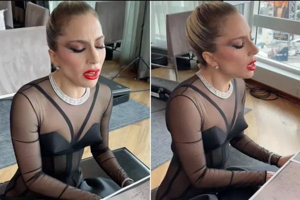 Tampil di karpet merah Oscar 2023, Lady Gaga mengenakan gaun Versace hitam tipis yang sama dalam video latihan tersebut.