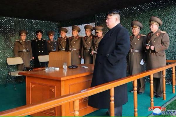 Pemimpin Korea Utara Kim Jong Un menyaksikan latihan serangan api, di lokasi yang dirahasiakan di Korea Utara 10 Maret 2023. Foto: KCNA via Reuters