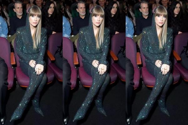 Dalam kesempatan itu, Taylor Swift mengenakan atasan dan celana berhiaskan berlian Alexandre Vauthier.