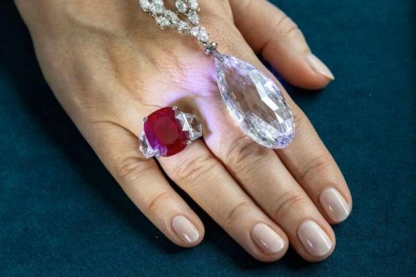 Batu Ruby Sunrise dan cincin Berlian 25 karat ditunjukkn sebagai koleksi perhiasan milik mendiang miliarder Austria Heidi Horten di Jenewa, Swiss, 8 Mei 2023. Foto: Reuters