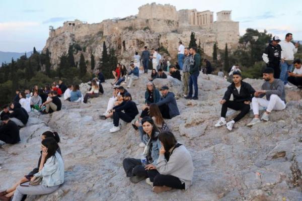 Orang-orang mengunjungi bukit Areios Pagos, dengan Propylaea Acropolis terlihat di latar belakang, di Athena, Yunani, 13 Mei 2023. Foto: Reuters