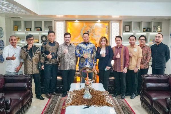 Ketua Umum Ikatan Motor Indonesia (IMI) Bambang Soesatyo atau akrab disapa Bamsoet (tengah) menerima panitia Kejurda Adventure Offroad Individual Non Winch 2023 serta jajaran SHERP, di Jakarta, Kamis (8/6/23).