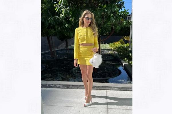 Penampilan kedua, bintang "Suicide Squad" memamerkan setelan rok Chanel kuning yang terinspirasi dari "Clueless" yang dipadukan dengan tas putih berbulu dan bagal Christian Louboutin yang serasi.