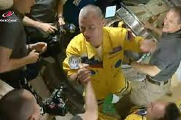 Kosmonot Rusia Denis atveev, tengah, dan Sergei Korsakov, kanan, tiba di Stasiun Luar Angkasa Internasional (ISS), 18 Maret 2022 - (foto: Roscosmos via AP/ euronews.com)