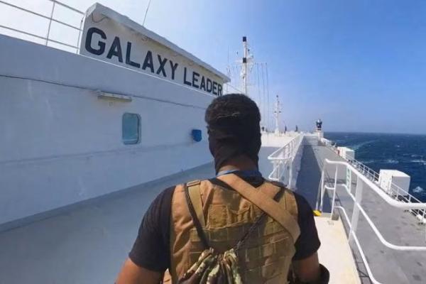 Seorang pejuang Houthi berdiri di atas kapal kargo Galaxy Leader di Laut Merah dalam foto yang dirilis 20 November 2023. Handout Houthi via Reuter