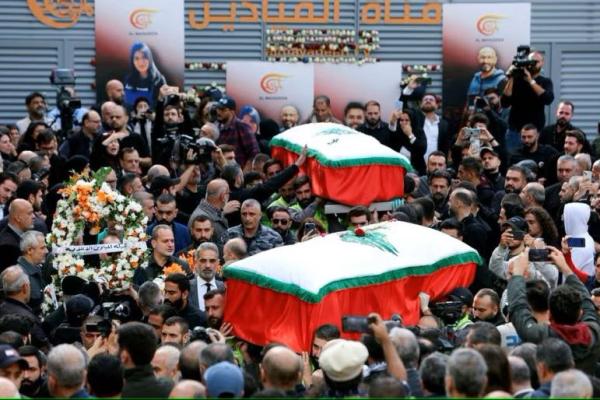 Para pelayat berdiri di dekat peti mati dua jurnalis yang bekerja untuk saluran TV Al Mayadeen menjelang pemakaman, di Beirut, Lebanon 22 November 2023. Foto: Reuters