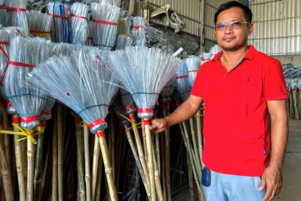 Has Kea berpose di samping sapu plastik di sebuah gudang di Phnom Penh, Kamboja, 15 Januari 2024. Foto: Reuters
