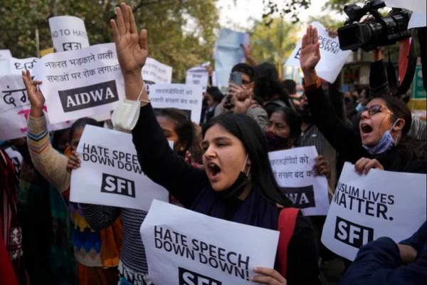 Aktivis dari berbagai organisasi sayap kiri meneriakkan slogan-slogan saat protes menentang ujaran kebencian di New Delhi pada 27 Desember 2021. (FOTO: AP PHOTO)