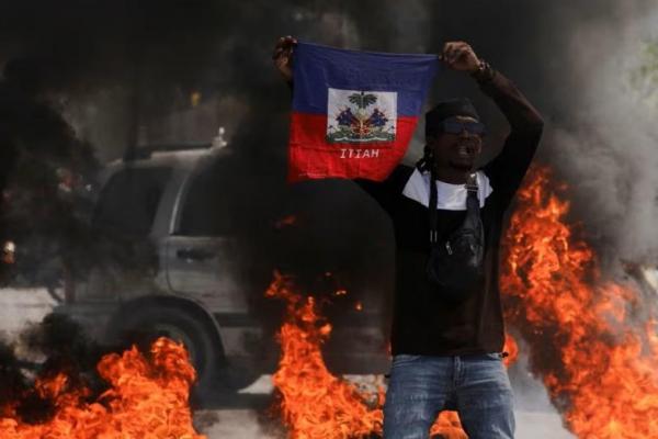 Seorang demonstran mengibarkan bendera Haiti selama protes terhadap pemerintahan Perdana Menteri Ariel Henry, di Port-au-Prince, Haiti 1 Maret 2024. Foto: REUTERS