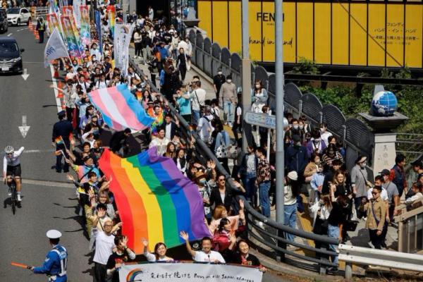 Peserta berbaris selama parade Tokyo Rainbow Pride di Tokyo, Jepang, 23 April 2023. REUTERS
