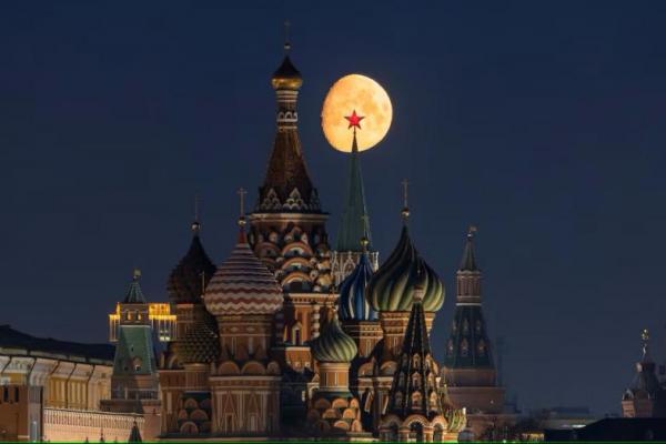 Bulan terbit di belakang Katedral St. Basil dan menara Kremlin di pusat kota Moskow, Rusia, 21 Maret 2024. REUTERS