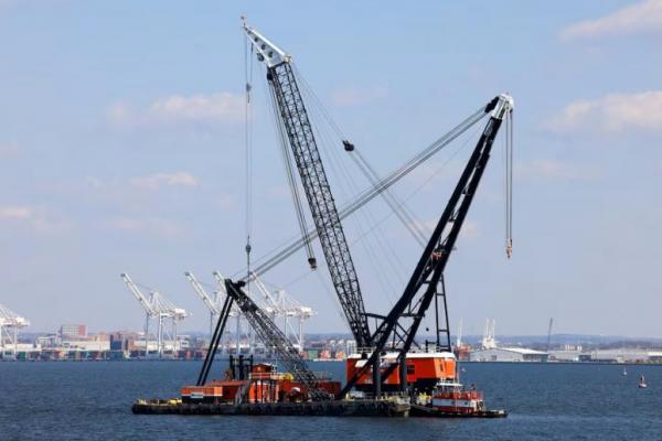 Para kru masih mensurvei kerusakan hingga tengah hari Jumat. Derek tersebut, yang mampu mengangkat beban hingga 1.000 ton, tiba pada Kamis malam dan mungkin akan mulai mengangkut puing-puing keluar dari air pada Sabtu pagi, menurut juru bicara Penjaga Pantai AS Carmen Carver.
