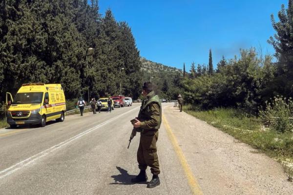 Seorang tentara Israel melihat ke tempat kejadian, setelah dilaporkan bahwa orang-orang terluka, dekat Arab al-Aramashe di Israel utara 17 April 2024. REUTERS