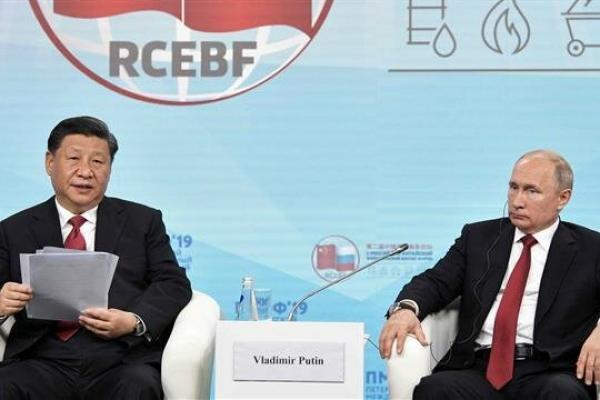 Presiden Rusia Vladimir Putin (kanan) dan rekannya dari Tiongkok, Xi Jinping, menghadiri forum energi selama Forum Ekonomi Internasional St. Petersburg (SPIEF) di Saint Petersburg, Rusia, pada 7 Juni 2019. (Foto oleh AFP)