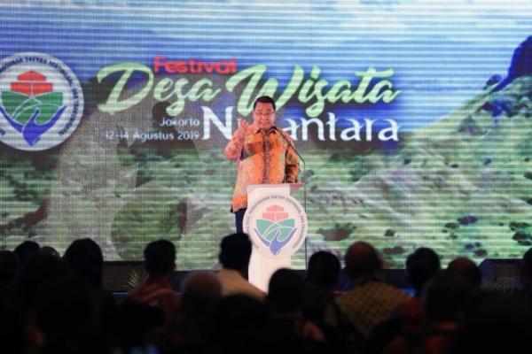 Menteri Desa, PDT dan Transmigrasi, Eko Putro Sandjojo membuka rapat koordinasi dan peluncuran Festival Desa Wisata Nusantara di Jakarta, Selasa (13/8/2019). Festival Desa Wisata Nusantara merupakan upaya percepatan pembangunan ekonomi dan pemberdayaan masyarakat desa di seluruh Indonesia. Foto: Matin/Kemendes PDTT